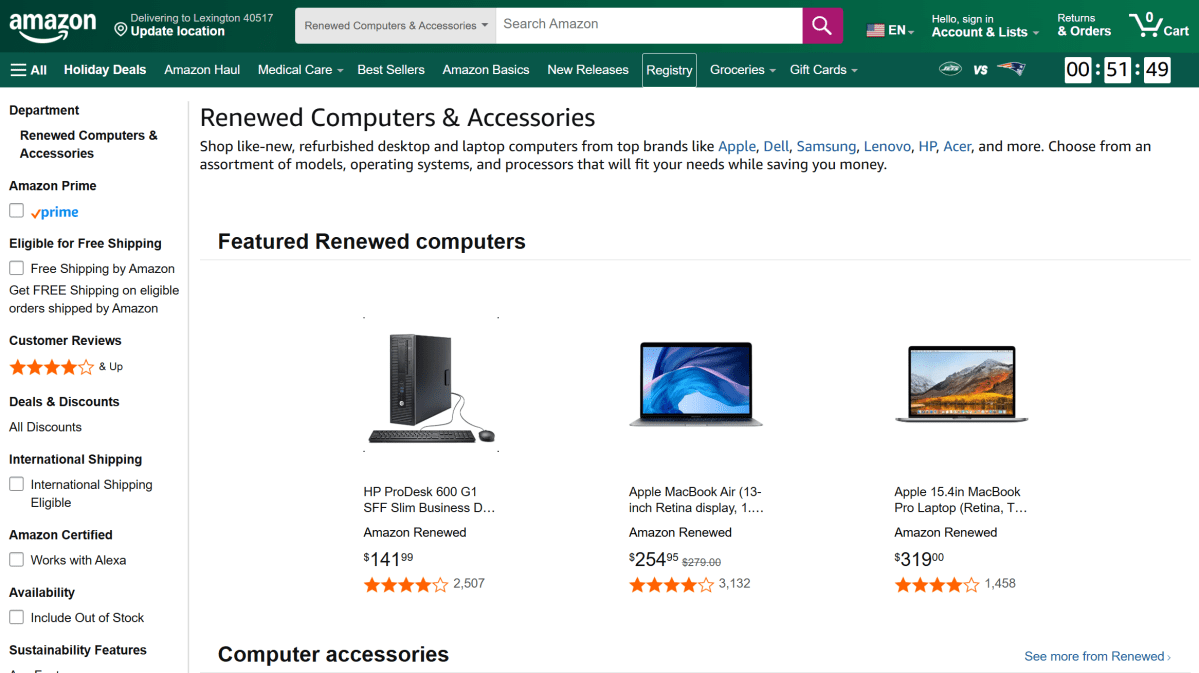 Os grandes varejistas também oferecem serviços concorrentes. Amazon, Best Buy e Walmart têm opções para comprar produtos de propriedade anterior ou restaurados de outra forma. Você pode verificar esses serviços via Amazon Restored, Best Buy Refurbished e Walmart Restored.