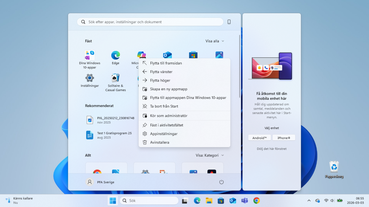 Na parte superior do menu Iniciar, você pode fixar os aplicativos que usa com frequência. Para fazer isso, clique com o botão direito no ícone do aplicativo (por exemplo, em Todos) e selecione Fixar no início. Você pode mover ou remover aplicativos que já fixou clicando com o botão direito.