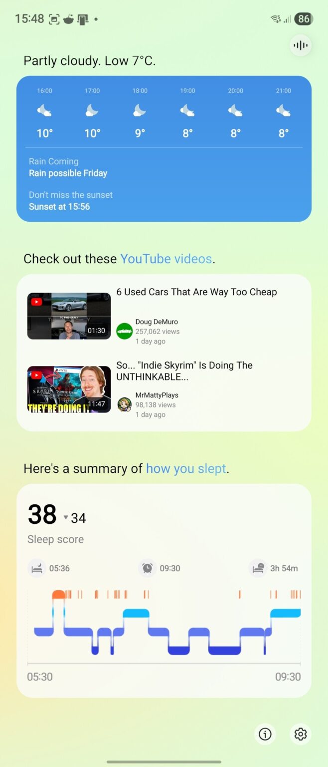 Uma mudança importante está nas recomendações do YouTube dentro do widget Now Brief. Em vez de mostrar dois vídeos em uma lista vertical, o One UI 8.5 usa um carrossel horizontal que é muito mais fácil de deslizar.