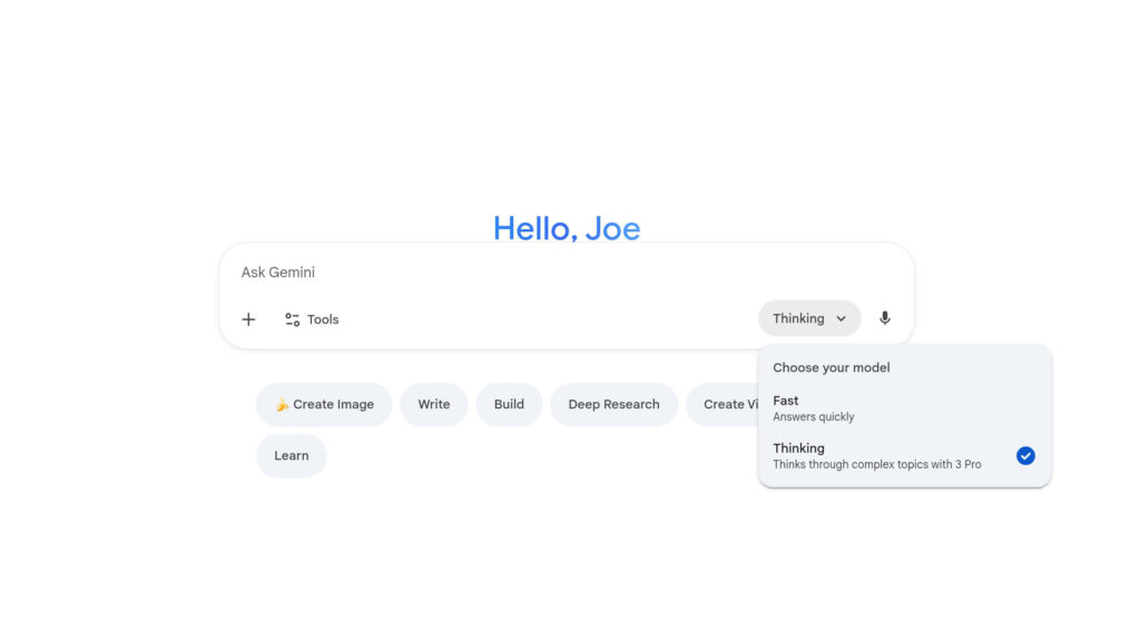 Rápido é selecionado por padrão, que usa o antigo modelo Gemini 2.5. Ainda é ótimo para perguntas mais simples, mas saiba que não é equipado com Gemini 3. Se quiser usar o Gemini 3 Pro – o único modelo Gemini 3 disponível atualmente – você precisará mudar para o Thinking.
