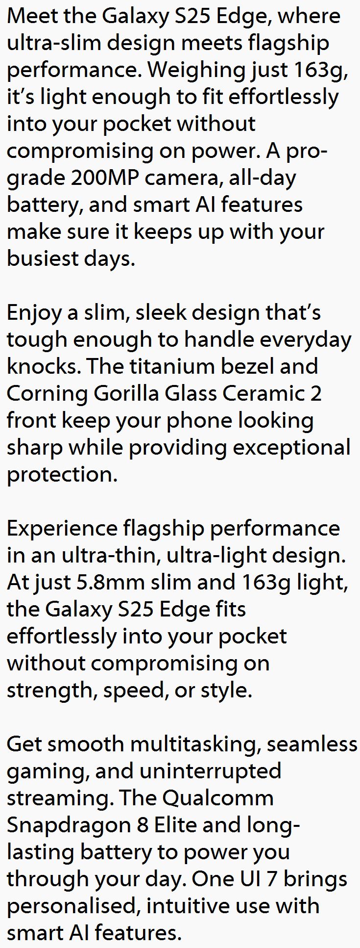 O vazador Evan ‘Evleaks’ Blass postou o que parece um comunicado de imprensa vazado ou material de marketing para o Galaxy S25 Edge. De acordo com esse vazamento, o Galaxy S25 Edge será de 5,8 mm fino e pesará apenas 163g. Diz-se que vem com uma câmera de 200MP de “grau”, uma bateria “durante todo o dia” e recursos de IA inteligente. Esse vazamento é interessante porque também menciona que o telefone possui uma moldura de titânio e vem com a frente da Corning Gorilla Glass Ceramic 2. Outros detalhes incluem a elite Qualcomm Snapdragon 8 e uma interface do usuário 7.