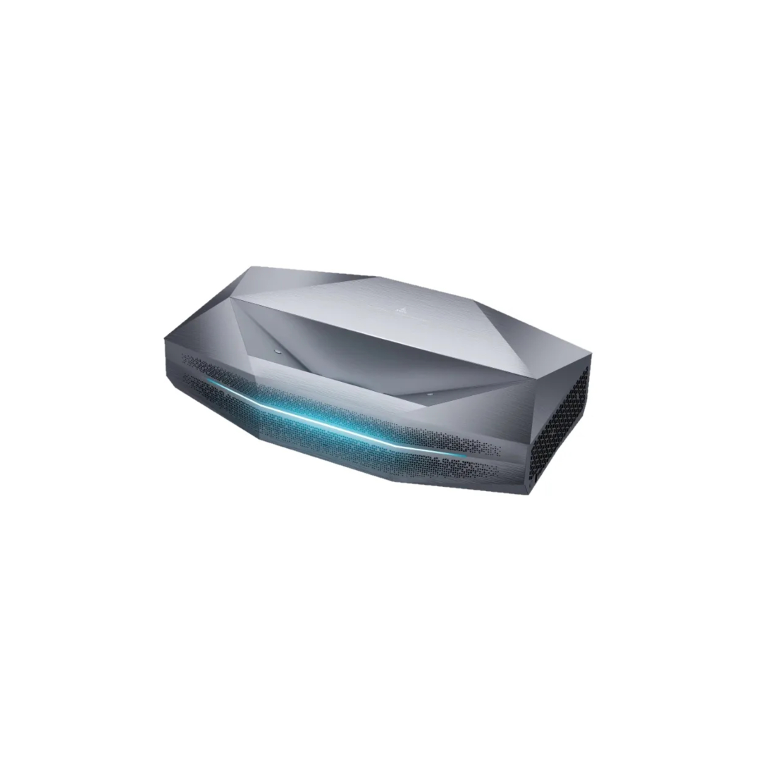 Fisicamente, o Aetherion abraça suas ambições de ponta com um design que parece saído diretamente da ficção científica. Entre sua forma angular, linhas nítidas e superfícies em camadas, parece menos um equipamento de home theater e mais uma pequena espaçonave estacionada na beira da minha sala de estar. Comparado com os projetores portáteis que tenho testado recentemente, é um gigante e faz pouco esforço para se misturar à decoração da minha casa. Medindo 22,13 × 12,72 × 5,49 polegadas e pesando 19,3 libras, também não deve ser carregado para fora para uma noite de cinema no quintal (pelo menos não por mim).