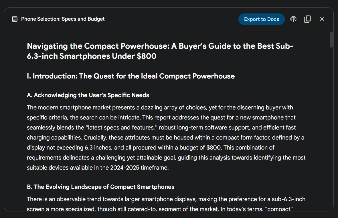 Fiquei impressionado com a estrutura do relatório. Começou com uma introdução ao cenário atual do smartphone e, em seguida, definiu meus critérios com mais detalhes – por exemplo, esclarecendo o que “suporte longo de software” e “carregamento rápido” significam no mercado de hoje. Em seguida, ele listou quatro smartphones que se adequavam aos meus critérios e dividiu a análise em seções importantes para mim, incluindo carregamento, preços, suporte a software e outros recursos. Fundamentalmente, também listou os prós e os contras para cada dispositivo.