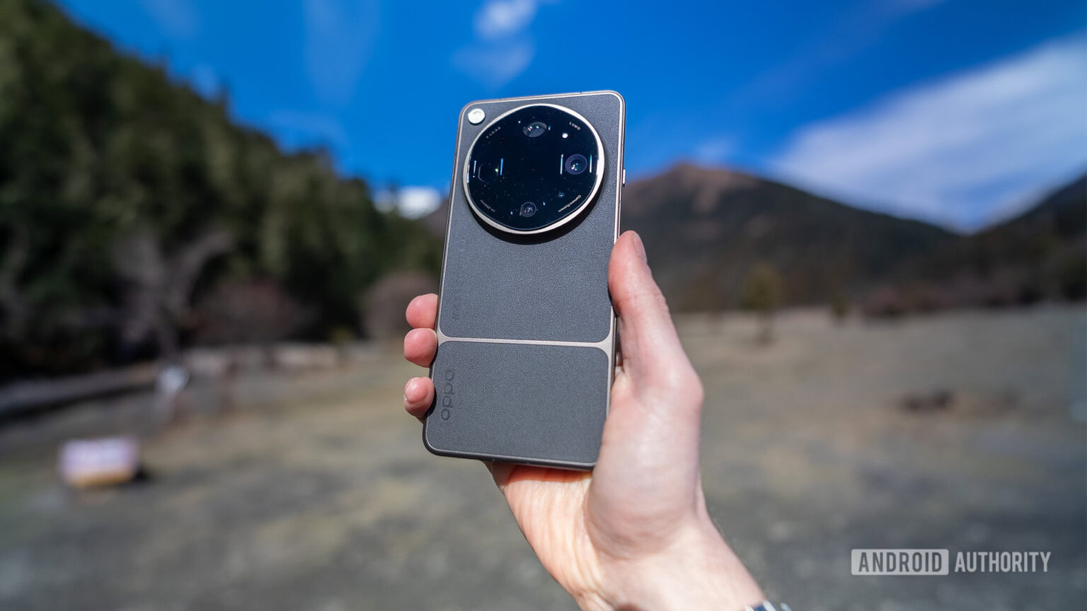 A OPPO também garante que você não confunda o Ultra com seus irmãos. Enquanto o Find X9 e o X9 Pro padrão seguem a construção usual (e possivelmente mais segura) de vidro e alumínio, o Ultra se destaca imediatamente com seu acabamento em couro e aquela enorme caixa circular Hasselblad. Não combina; foi feito para parecer uma câmera dedicada.