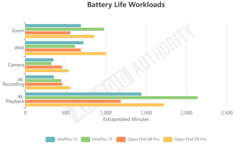 Dito isto, essas médias não são uniformes – os ganhos variam dependendo da carga de trabalho e do dispositivo. As melhorias do OnePlus 15 não são tão consistentes quanto as do OPPO. Ainda assim, é seguro dizer que os ganhos da bateria são reais. Mesmo considerando cargas de trabalho, possíveis ineficiências e alterações de hardware, essas grandes células de silício-carbono oferecem quase sua vantagem teórica quando calculada a média de um dia ou mais de uso no mundo real.